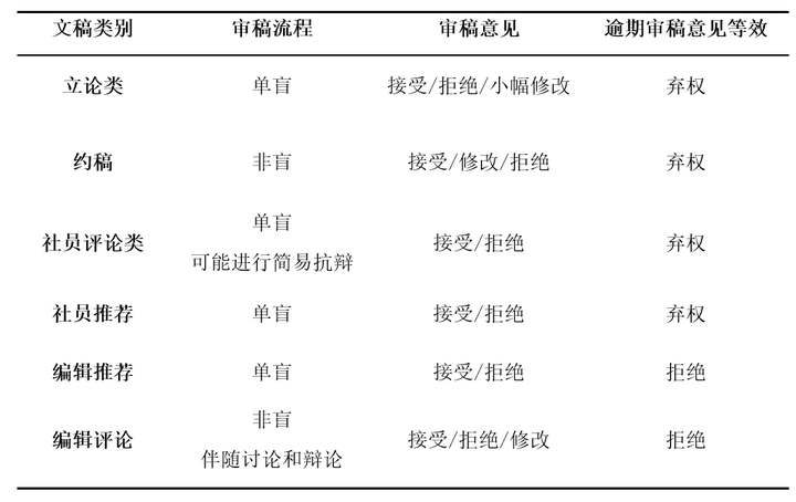 编辑评论类文稿的审稿将建立一个针对该稿件审理工作的微信群或其他相同职能的平台,供对稿件内容的讨论和先于刊载的苏格拉底方法。该微信群或等效平台包含全部编辑组成员,并在审稿工作结束后解散。编辑评论的审稿周期不变,依然为分发稿件后的 7 个自然日。对于逾期未能提交审稿意见的情况,该审稿人的意见将被默认为否决,而非弃权。考虑到在微信群或等效平台内的辩论工作,单盲审稿将无法进行,作者身份将在审稿过程中可见。
