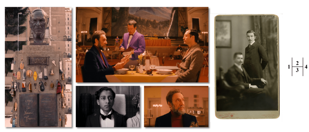 在介绍神的名字时,我们已经谈过了穆斯塔法。这是一个有点过分常见的中东名字,奥斯曼帝国的国君叫穆斯塔法,现代土耳其的国父叫穆斯塔法,电影《布达佩斯大饭店》里的阿达萨朗阿迦百难民也叫穆斯塔法(图 4-3)。我想简单提一提这部早已广为人知的电影,可以说一说这个名字,也算提供一个宗教暗喻在艺术作品中的广泛性的例子。在这部电影中,泽罗·穆斯塔法身为门童,是大饭店最低微的职位,却被大堂经理古斯塔夫先生选中,开始了接下来的一段传奇。穆斯塔法意为「神选之人 | chosen, selected, appointed, and preferred」,古斯塔夫则意为「神的使者 | God’s staff」。最终,为了从纳粹手中救下穆斯塔法,古斯塔夫牺牲自己,死在了行刑队的枪下,将自己的所有财富留给了他。神的使者选中了神选之人,神的使者以完成自己使命的形式退出舞台、成就了神选之人。以及,整个电影更大的结构是,这部电影本身是由国宝级作家(图 4-1)从穆斯塔法口中得到的故事(图 4-2)。作家听到了故事并写成上述带有隐秘的神话意味的作品,于是作家在这里扮演撰经传道者的身份,而穆斯塔法则干脆扮演神。宗教在这部电影中的参与较为隐含,不是以视觉元素出现在画面里,而是在结构和象征中。读者如果觉得这段说辞不免穿凿附会,就须要考虑到作者的创作脉络:《布》改编自斯蒂芬·茨威格(图 4-4)的作品《同情之罪》,其作品以反战和控诉法西斯为主,并有过以宗教为喻体的前例。1919 年,他创作了反战题材戏剧《耶利米》。读者意识到,这个戏剧其实取名自《旧约》的《耶利米书》,那部圣典则讲述了巴比伦大军攻占耶路撒冷的故事。艺术作品中角色的名字不由父母给予,而是由作者拟定,作者是其笔下角色实在意义的生母。一位曾直接以圣书来命名作品的作者,继续在作品中安置基督教隐喻,我认为是一件合理的事情。