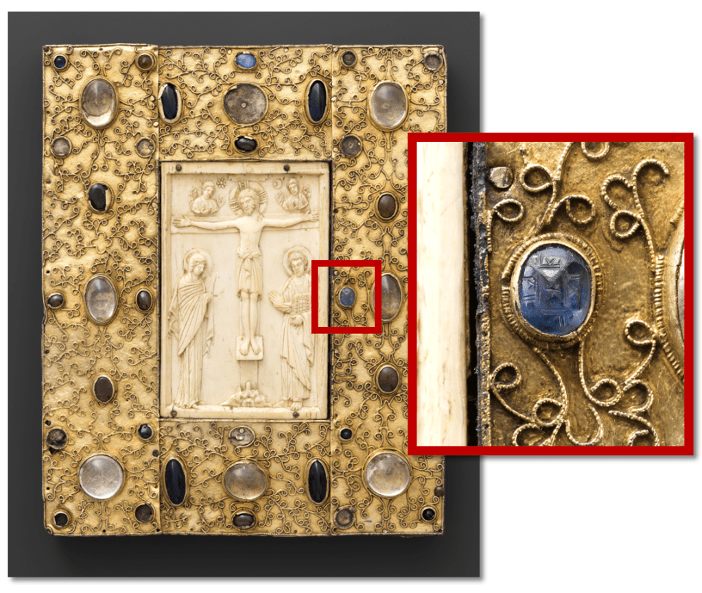 拜占庭式的象牙雕刻在西欧受到高度重视,它们因而在教堂的宝库中保存完好,或被用于豪华书籍装帧。面板中心的象牙雕刻原本来自于拜占庭三联画龛的中心,它可能是送给圣克鲁斯德拉塞罗斯修道院的众多礼物之一,该修道院由费利西亚女王(卒于 1085 年),即阿拉贡和纳瓦拉国王桑丘五世拉米雷斯(于 1076-1094 年在位)的妻子创立。这一华丽的封面上还钳有一枚蓝宝石印章(插图),位于圣约翰的右侧,用阿拉伯文刻有九十九个「优美神名」中的四个4。